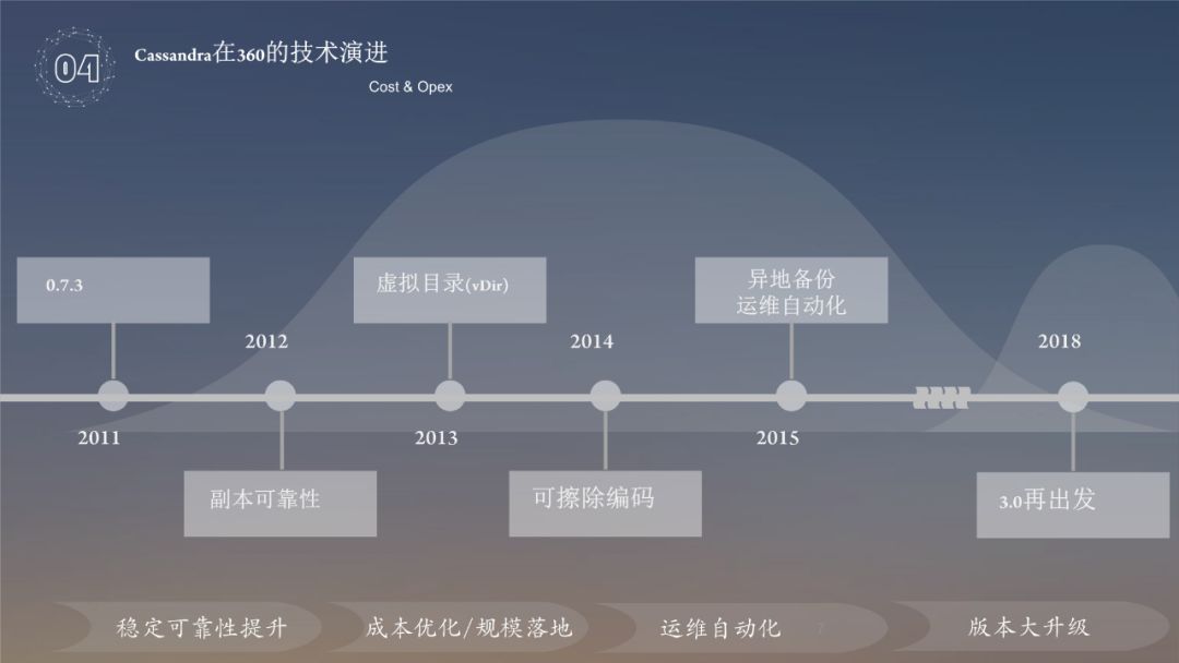 Cassandra 自2010在360开始调研技术落地;2011年使用 Cassandra 0.7.3作为基础版本应用于生产环境;2012年完善数据可靠性和安全性,实现不停机和不单纯依赖读修复的数据快速恢复;2013-2014年以节省成本为目的,实现可擦除编码技术应用于 Cassandra,在确保数据安全和可靠性的前提下实现成本降低60%;2014-2015年面对超大规模集群的超复杂性问题,实现运维自动化,集群具备自主自愈、自主风控等自主运维能力 ( 近 1w5 物理节点,89个集群,两人运维 );2018年,我们发现 Cassandra 社区版本与360版本相当于是不同场景殊途同归 ( 社区为轻 Value,360为重 Value ),并且社区很多好的思路非常值得考虑,因此我们重新调整研发策略,与社区共同成长。