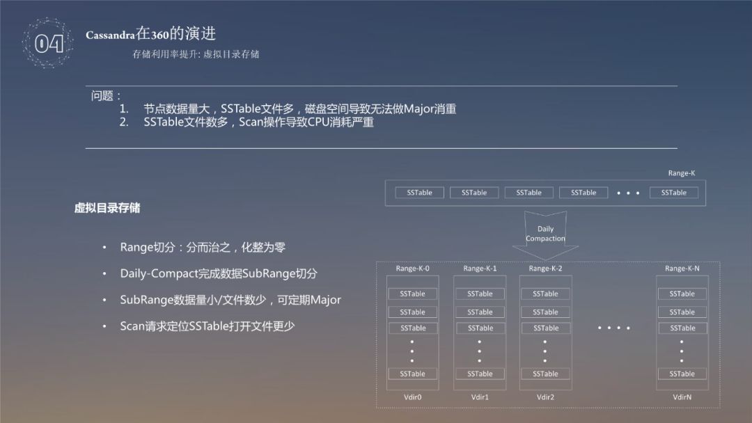对于这两个问题,当时磁盘的利用率达到50%就无法再提高利用率,继而我们采用了分而治之的思想,把一个大 range 使用 Daily—Compact 完成数据 SubRange,切分为几个小 range,每个 range 代表一个目录,由于切分以后,数据量变小,每个 range 都可以做自己的 major,可以把重复的部分都清除掉 ( 但是如果在磁盘利用率90%以上,做一次 major 就很消耗 CPU 性能 ) ,这样做以后,对于 Scan 请求定位 SSTable 打开的文件会更少,效率就会更高,速度也会更快。