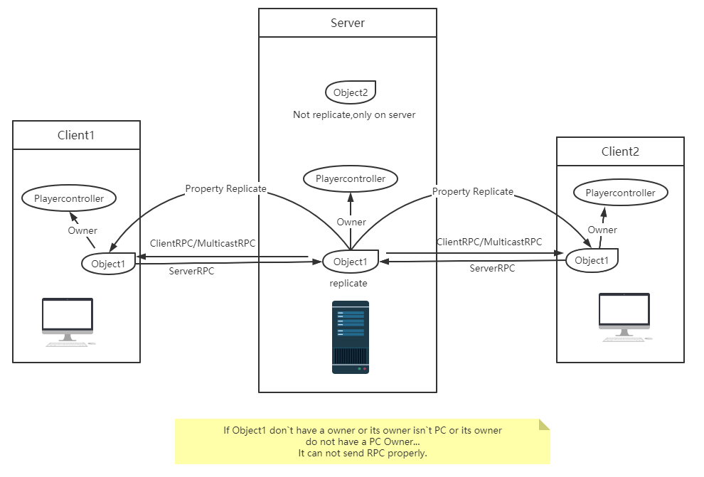 无论是RPC,还是属性同步,你会发现他都是基于UObject的,或者更确切的讲都是基于Actor的(以及其附属组件)。因为这两种功能一个是利用类中的函数,另一个是利用类对象的属性,他们都需要与某一个具体的对象作为媒介,而在UE的架构中,设计都是面向对象的,每个Actor都可以理解为游戏世界的对象。