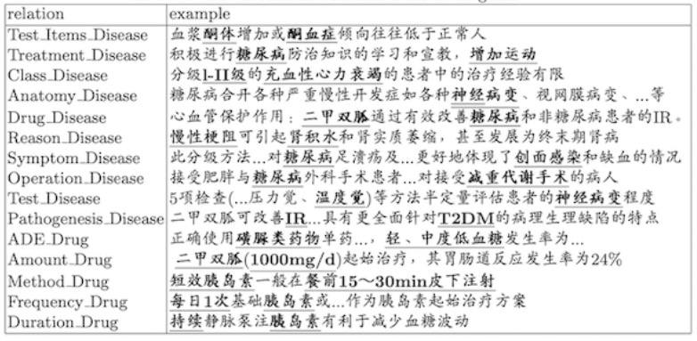 本数据集标注由两位经验丰富的内分泌专家设计了标注指南。本指南侧重于“实体”和“关系”,因为这两种类型是知识图谱的基本元素。共定义了18类实体类型和15类医学关系。实体关系类型定义和示例如表1和表2: