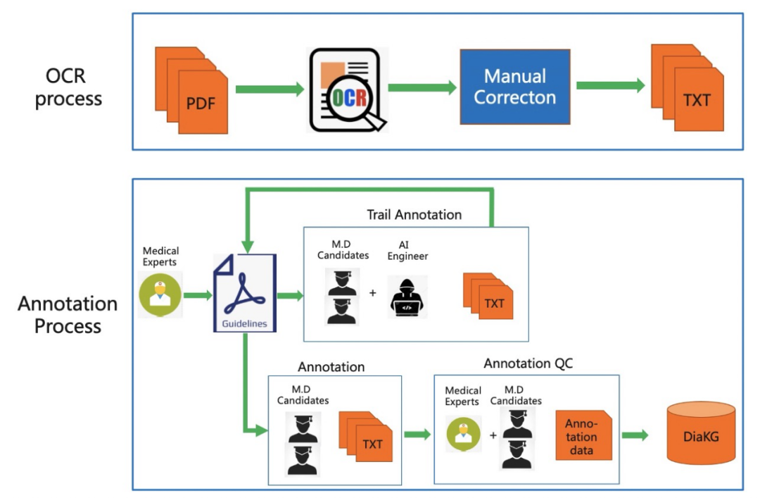 首先通过OCR工具将原始的PDF专家指南文件转换为纯文本格式,之后由标注人员对OCR识别结果进行校正,诸如“β细胞”被识别为“B细胞”,确保识别出来的文字和符号都是正确的。因为本数据集是侧重文本的,因此原始PDF中出现的表格、图表等信息均做了过滤,仅留下文本信息作标注。