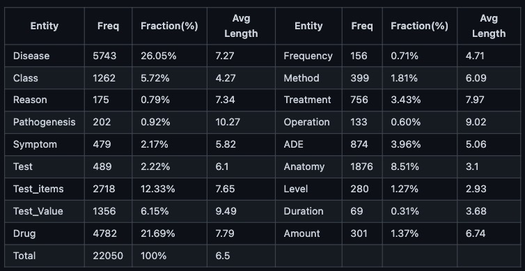 1. 实体数据可能由很长的序列span组成,如表3所示,“发病机理(pathogenesis)”平均长度是10.3个中文字符,对常规的NER模型是个挑战;