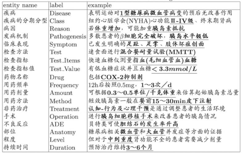 标注过程分为试标注(Trail Annotation)、正式标注和质检三步。试标注阶段的反馈信息会汇总给两名医学专家用于优化标注规范,通过多轮标注最终得到了人工标注的高质量表糖尿病知识图谱数据集。标注规范见下图: