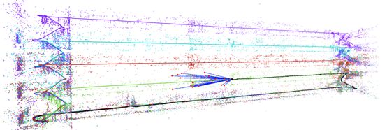 因此,该用例演示了从4个独立的轨迹创建大学建筑地图的过程。每条轨迹都穿过建筑物的地面,楼梯和另一层楼。它们结合在一起超过1000米,包含约463,000个地标。在这样大的地图上,许多常见的操作(例如优化或循环关闭)很快就变得棘手,无法仔细选择数据。为此,我们采用了基于顶点距离,方向和界标隐形(landmark covisibility)的启发式关键帧方案。Maplab的闭环算法正确识别了所有场景之间的几何变换,非线性优化改进了几何【?】。结果是一个8.2 MB的紧凑的,几何一致的定位图,可以被ROVIOLI用于整个建筑物的定位,如图1所示。