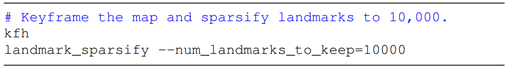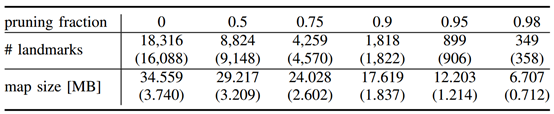 基于特征的大型模型,可能在构建多个场景中,很容易包含数千个路标并达到相当大的存储空间。然而,并不完全需要的保留所有的路标以保证ROVIOLI的良好的定位质量。Maplab提供了基于[11]的地图汇总功能,该功能使用基于整数(integer-based)的优化来执行路标选择。该算法试图去除最不常见的地标,但与此同时保持对环境的均衡覆盖(balanced coverage)。Maplab还包括一个关键帧算法,用于去除多余的顶点,只保留一个有效而准确的状态估计所需的顶点算法。通过去除顶点,我们也消除了许多顶点路标相关联的含有一定尺寸的描述子。汇总(summarization)和关键帧都可以显著降低模型尺寸,而不会在位姿估计质量方面造成大的损失。