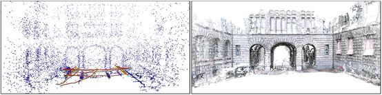 图8:maplab提供了两种不同的稠密重建工具。顶部:立体稠密重建用于基于灰度图像和优化的摄像机姿态来计算深度图。然后,他们融合在voxblox [38]创建一个表面网格进行融合。3个EuRoC数据集[4](MH1-3)相结合,创建一个对齐和优化的VI图。底部:CMVS / PMVS2 [39]重建结果基于一个单一的记录场景,使用一个RGB相机和多相机系统。