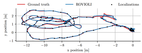 其次,该框架包含一个名为ROVIOLI的在线视觉-惯性建图和定位前端。它可以从原始的视觉和惯性传感器数据建立新的地图,并且如果提供定位图则追踪实时的全局(无漂移)姿态。以前的工作在不同的机器人平台上使用了这种能力,并展示了它能够准确跟踪包括导航和轨迹跟踪在内的多种应用的全局位姿。