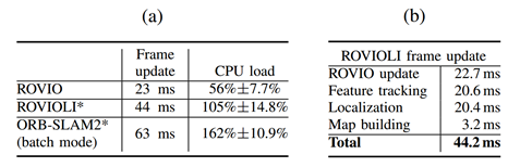 表II:(a)在20Hz处理的EuRoC MH1数据集上的ROVIO,ROVIOLI和ORB-SLAM2的时序和CPU负载。在ROVIOLI和ORB-SLAM2的情况下(用*标记),估计器被设置为根据由EuRoC MH2构建的地图进行定位。所有报告的值都是在Intel Xeon E3-1505M@2.8Ghz上测得的。800%的CPU负载对应于充分利用CPU的全部8个(逻辑)内核。(b)ROVIOLI独立块的单帧处理时间。由于他们并行运行,总时间并不对应于各个块的总和。相反,这个时间是完全处理单个帧所花费的时间。