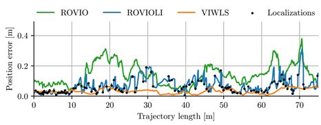 图5:在EuRoC机械大厅数据集(the EuRoC machine hall dataset)上评估ROVIOLI [40]。顶部:用ROVIOLI位置估计的地面实况位置。底部:ROVIO视觉惯性里程计线程位姿误差[3],ROVIOLI和优化的VI-地图(VIWLS)与地面实况相比的位置误差。
