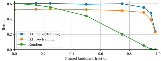 图6:在ILP地标总结和关键帧+总结(landmark summarization and keyframing + summarization)(括号内)后的定位性能和地图大小。关键帧删除包括顶点-路标关联的顶点,有效地使地图更小。原始的地图有6,258个顶点,而关键帧图则包含760个关键帧。关键帧持续减少了少量百分比的召回,而总结只影响当修剪的标志性分数超过85%的质量【?】。 为了比较,我们提供了一个随机选择要删除的路标召回曲线【?】。