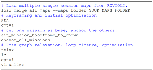 在许多建图应用中,不可能在单个场景建图中覆盖整个环境。除此之外,可能需要在尽可能多的不同的视觉外观条件下捕捉环境[7]。因此,maplab提供了将来自多个场景的地图共同注册到一起的工具,并共同完善它们以获得单个一致的地图。