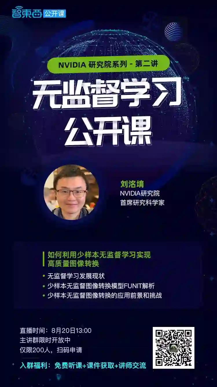 8月20日13点,刘洺堉老师将继续带来第二讲——无监督学习公开课。他将解析无监督学习在图像转换领域的创新和应用,主题为《如何利用少样本无监督学习实现高质量图像转换》,内容包括无监督学习的发展现状、无监督学习在图像转换领域的的应用和创新、少样本无监督图像转换FUNIT模型的实现和应用。