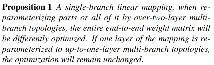 命题1:一个单分支线性映射,当通过超两层多分支拓扑重参化部分或全部时,整个端到端权重矩阵将得到不同的优化。如果映射的一层被重参化到多达一层的多分支拓扑,则优化将保持不变。