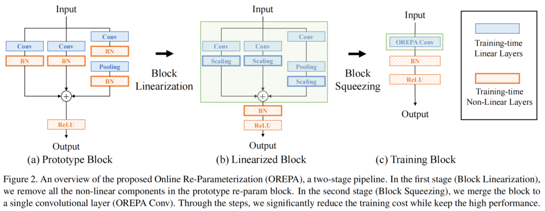 基于观察结果,作者提出了在线重参化(OREPA)(图1(c)),这是一个两阶段的pipeline,使之能够简化复杂的training-time re-param block。