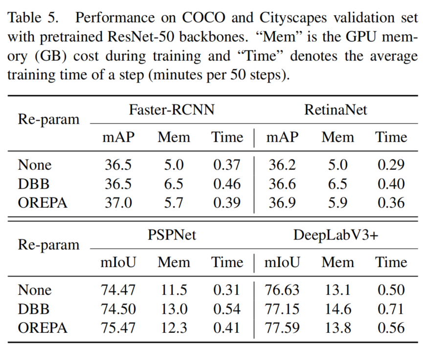 training-time block压缩成单个卷积来减少巨大的训练开销。为了实现这一目标,本文引入了一个线性缩放层,以更好地优化在线块。在降低训练成本的帮助下,作者还探索了一些更有效的重参组件。与最先进的重参模型相比,OREPA能够节省约70%的training-time成本,并加速训练速度约2×。同时,配备OREPA,模型在ImageNet上的方法高出+0.6%。作者还进行了目标检测和语义分割的实验,并显示了对下游任务的一致改进。