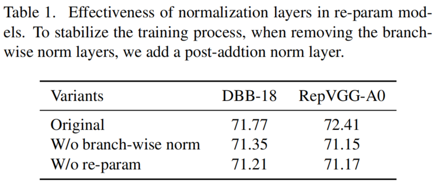 作者认为中间BN层是重参化过程中多层和多分支结构的关键组成部分。以SoTA模型DBB和RepVGG为例,去除这些层会导致严重的性能下降,如表1所示。