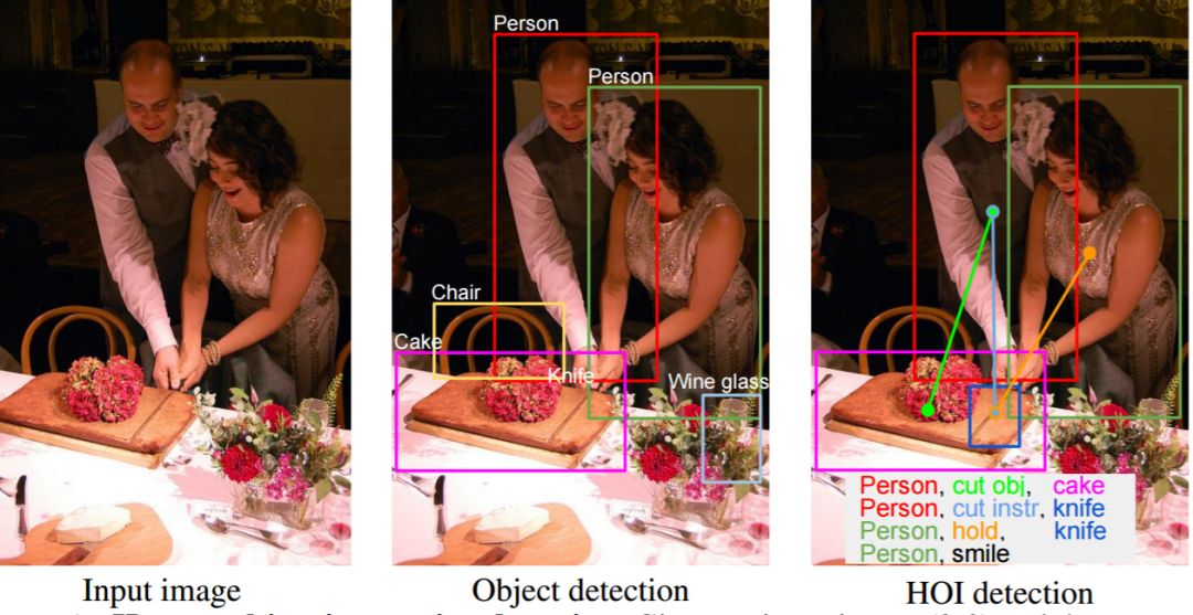 图 1:人 - 物体交互检测。给定输入图像(左)和图像中检测到的对象实例(中),利用本文提出的模型检测并识别每个人之间的交互以及与他们交互的物体(右)。
