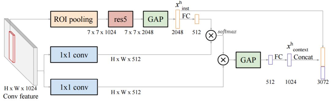 图 4:iCAN 模块。给定图像的卷积特征(以灰色显示)和人/物体边界框(以红色显示),iCAN 模块提取实例