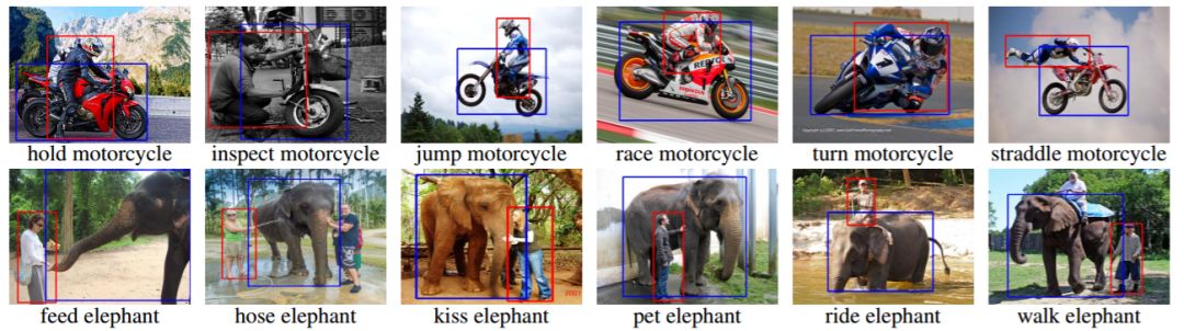 图 6:HICO-DET 测试集上的 HOI 检测样本。研究者的模型检测到对同一类别物体的不同类型的交互。