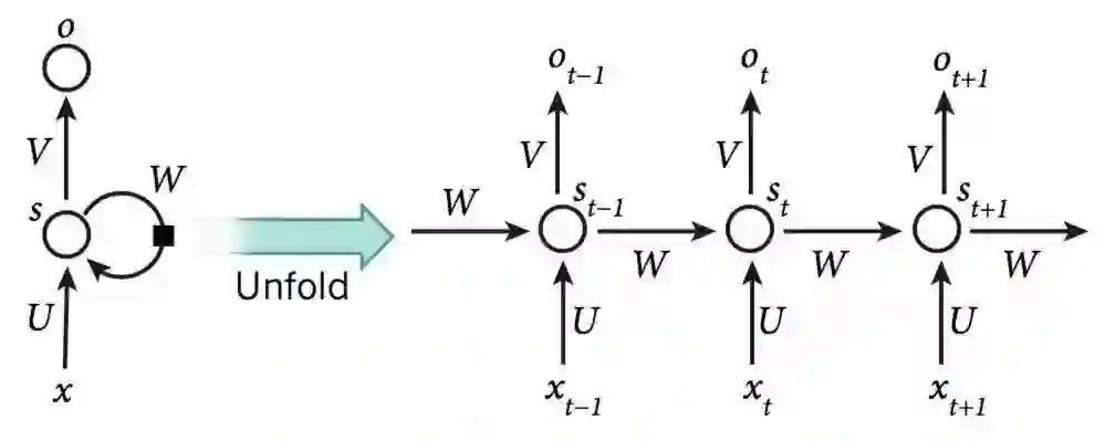 RNNs一旦展开(如图5),可以将之视为一个所有层共享同样权值的深度前馈神经网络。虽然它们的目的是学习长期的依赖性,但理论的和经验的证据表明很难学习并长期保存信息。