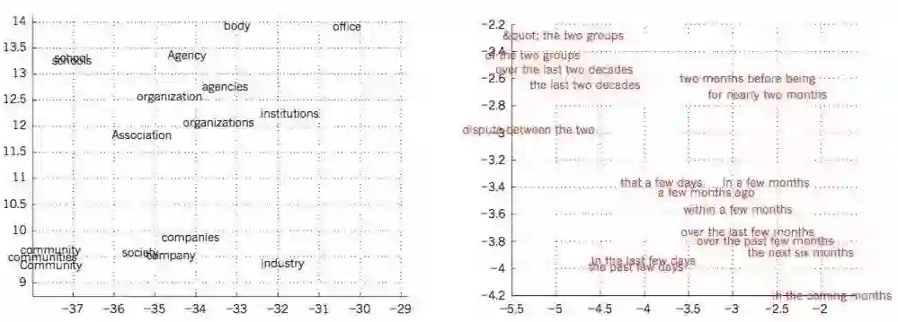 而是在利用“微规则”(‘micro-rules’,本文中直译为:微规则)学习过程中被发掘,并作为一个分解输入与输出符号之间关系结构的好的方式。当句子是来自大量的真实文本并且个别的微规则不可靠的情况下,学习单词向量也一样能表现得很好。利用训练好的模型预测新的事例时,一些概念比较相似的词容易混淆,比如星期二(Tuesday)和星期三(Wednesday),瑞典(Sweden)和挪威(Norway)。这样的表示方式被称为分布式特征表示,因为他们的元素之间并不互相排斥,并且他们的构造信息对应于观测到的数据的变化。这些单词向量是通过学习得到的特征构造的,这些特征不是由专家决定的,而是由神经网络自动发掘的。从文本中学习得单词向量表示现在广泛应用于自然语言中。