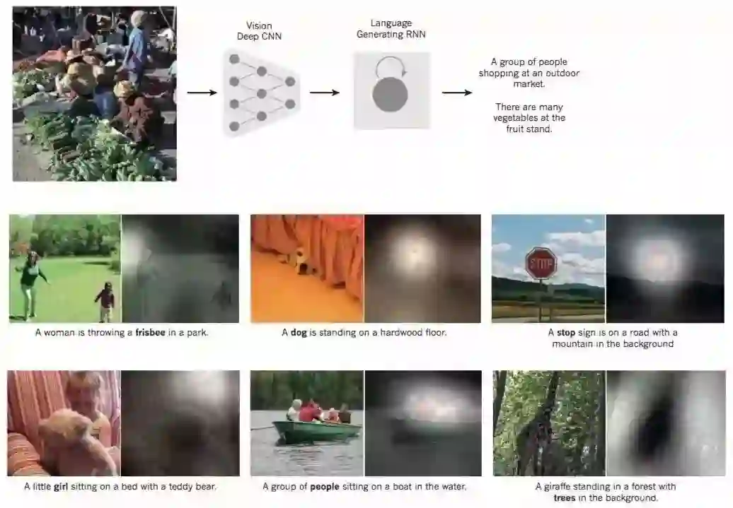 类比于将法语句子的意思翻译成英语句子,同样可以学习将图片内容“翻译”为英语句子(如图3)。这种编码器是可以在最后的隐层将像素转换为活动向量的深度卷积网络(ConvNet)。解码器与RNNs用于机器翻译和神经网络语言模型的类似。近来,已经掀起了一股深度学习的巨大兴趣热潮(参见文献[86]提到的例子)。