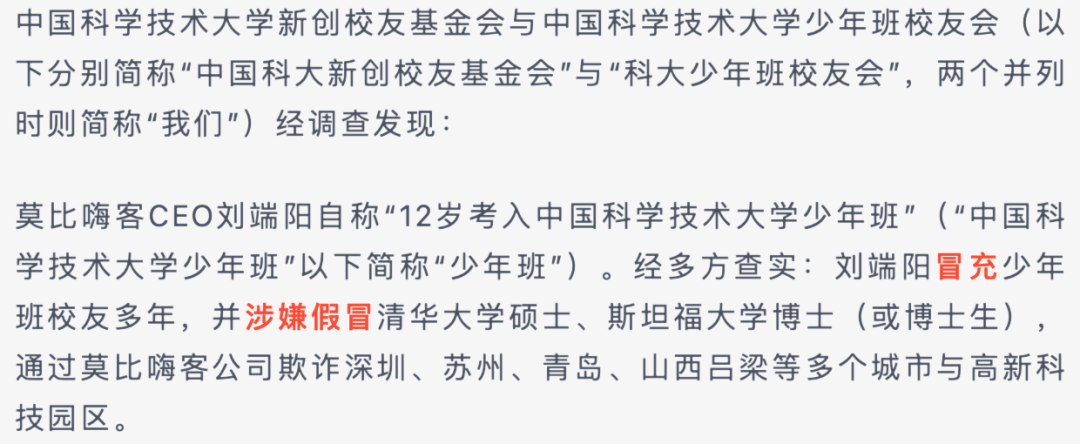 9月5日「中国科大新创校友基金会」与「科大少年班校友会」发送电子邮件给刘端阳和莫比嗨客公司,要求在24小时内给出回复。