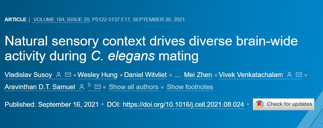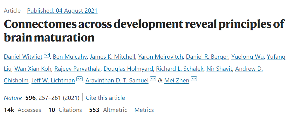 线虫神经系统的3D模型。线虫只有302个神经元,因此它是第一个(也是迄今为止唯一的)可以编译出完整、详细的连接组的动物。科学家将复杂的交配行为分解为寻找伴侣、交配和休息等子类。然后将神经元活动映射到蠕虫的连接组上,以识别在交配过程中处理环境信息的大脑机制。据该研究论文的第一作者、神经科学家Vladislav Susoy介绍,由此产生的大脑活动图在研究中使用的8种蠕虫之间显示出高度一致,以至于可以用来预测第9种蠕虫的行为。因此,科学家们决定通过实验来检验这个预测。以一种新的蠕虫为例,他们精确地移除了这种蠕虫与「转动」有关的五个神经元中的一个,结果,蠕虫果然失去了转动的能力。 Susoy说:「这种联系如此清晰,真是令人惊讶。」研究斑马鱼大脑的哈佛大学神经科学家Florian Engert称,这篇论文是该领域的「里程碑」,因为它使用连接组来考察复杂的行为。他表示,连接组正在成为一种关键资源。「它可以作为研究神经元回路如何运作的工具和数据库。」恩格特实验室的神经科学家和博士后研究员Gregor Schuhknecht说。不过,除了解释动物行为的基础之外,连接组学研究还可以揭示关于这些行为如何连接到大脑的微妙细节。Lichtman表示,大脑可以用无数种方式做事。我的猜测是,在几乎所有情况下,大脑神经系统很少采用最简单的路径,因为它的设计并不简单。例如,一段时间以来人们都知道,对线虫而言,幼虫和成虫的神经元之间的连接形式是明显不同的。为了了解大脑整个发育过程中的变化。 在最近《自然》上的一篇文章中,Lichtman,Samuel and Mei Zhen等研究人员比较了八个基因完全相同的蛔虫幼虫和成虫之间神经元连接方式的差异。根据论文第一作者Daniel Witvliet的说法,这项研究最有趣的发现是,尽管这些蠕虫在基因上是相同的,但它们大脑中神经细胞之间的连接有多达40%是不同的。这一发现表明了对大量大脑链接图进行比较的重要性。「你不能只是说,'我们已经绘制了蠕虫连接组图',因为每个连接组都是略有不同的。」Witvliet说。Lichtman说,这一发现表明存在两类连接:可变的连接和一致的连接。如果事实证明,动物需要建立更一致的连接,来支持生存所必需的神经活动,那么他认为,一些连接的变化程度可能成为连接组中重要特征的标志。「如果可以比较多个连接组,就可能看出特征上的重要差异,而不是完全随机的。」Lichtman说。 他表示,在未来,连接组学能定期分析多个个体的大脑,比较健康和不健康的动物、年轻和年老的动物等等。「我认为,一旦绘制大脑神经连接图成为平常之事,这很可能会成为现实。」