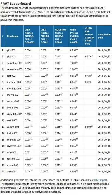 最新一次的FRVT测评结果是2018年10月中旬提交,本次共有39个厂家参与,相比4个月前多了7家,分别是Anke、比特大陆(Bitmain)、大华股份(Dahua)、商汤科技(Sensetime)、Saffe、Tech5,以及文安智能(Vion)。