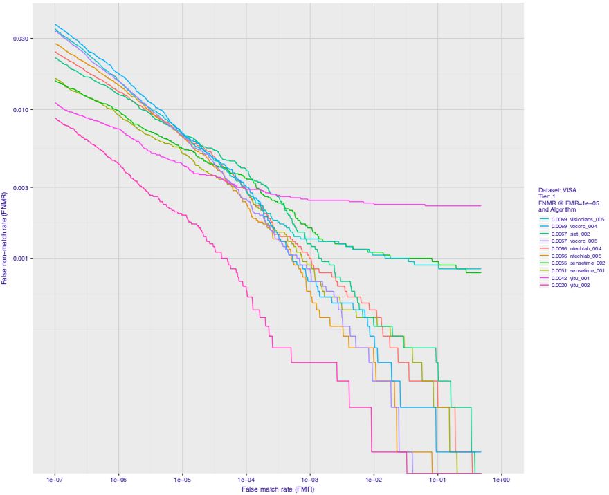 2018年10月中旬FRVT测评,Visa测试集上误识和漏报相关(ROC)曲线。排在第一名的是依图科技今年10月提交的算法(最下方的紫红色线条),也是参赛团队中在千万分之一误报指标下,唯一将漏报率降到1%以下的团队。来源:FRVT