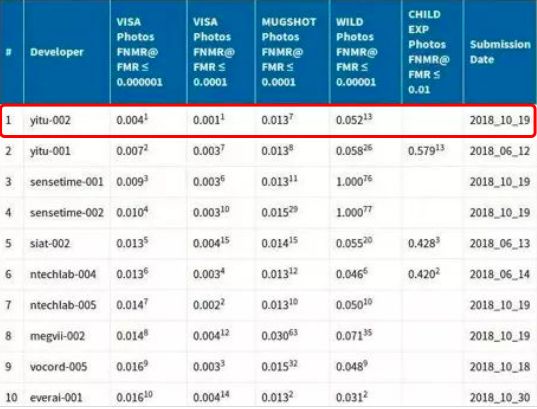 值得一提,yitu-001是依图科技2018年6月评测提交的算法,时隔多月仍然处在前十之列。