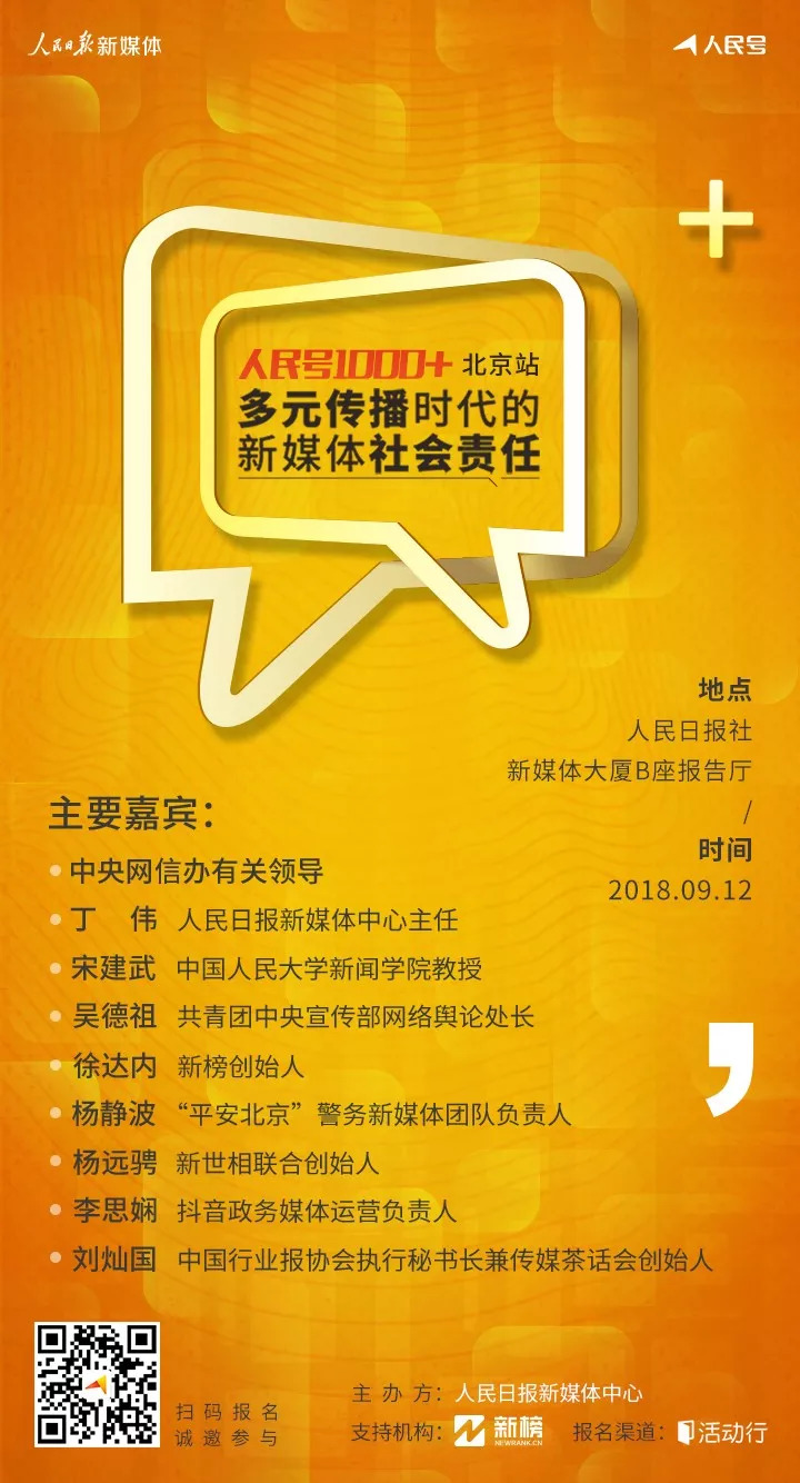 9月12日,人民日报新媒体中心将在北京举办“多元时代的新媒体社会责任”——“人民号1000+”计划•北京站活动。现场将邀请来自主管部门、人民日报新媒体中心、高校、各类政务和媒体、自媒体机构嘉宾,分享新媒体行业发展趋势和人民号发展新动向,共同探讨新媒体再蓬勃发展的同时如何更好地倡导主流价值,履行好社会责任。