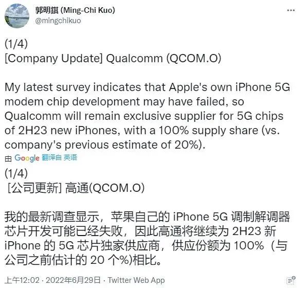 这也应验了分析师郭明錤几个月前的“剧透”。他表示,苹果的自研 iPhone 5G modem 芯片遭遇了失败,至少在 2023 年下半年的 iPhone 15 系列上,高通还将是 iPhone 独家的 5G 基带供应商。