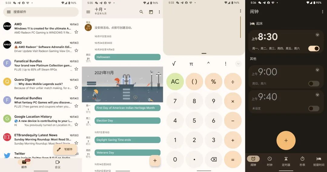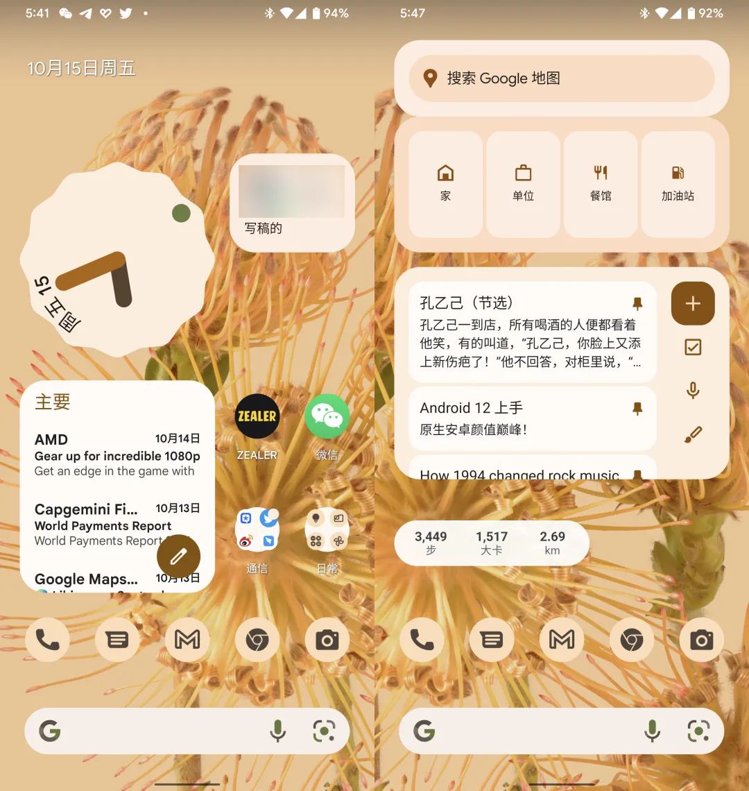 Android 12 的小组件现在全面适应圆角化,对于旧版的小组件,系统会自动将其裁剪为圆角。若是适配了 Android 12,小组件会自动为背景选取主题色,形形色色,均与 Android 12 的系统风格相协调。