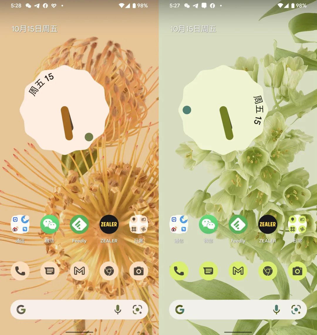 首先就是这套基于主屏幕壁纸的主题系统,它会根据不同壁纸、壁纸上不同的位置提取主题色以及互补色。如果你在使用特定的谷歌动态壁纸,系统还能动态地提取主题色。