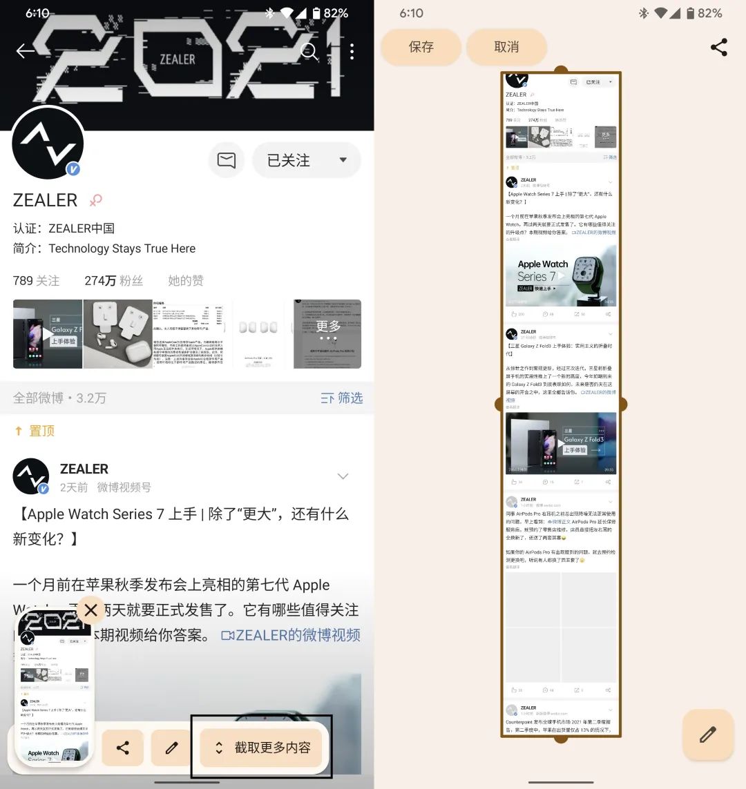 常用功能上,原生的 Android 12 终于看到了国内 OEM 的尾气。比如说,Android 12 终于——终于支持了滚动长截图。就目前阶段的体验来看,Android 12 原生的滚动截图还有待打磨,不仅支持的应用有限,上下截取范围也有限,希望后续能继续改进一下。