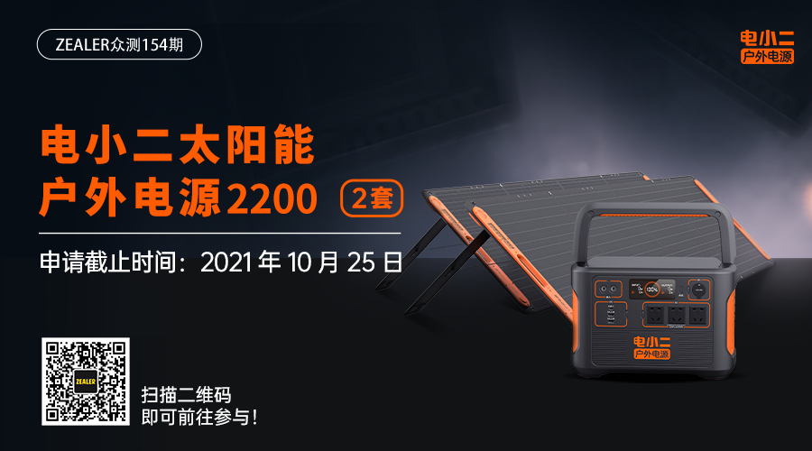 本期 ZEALER 众测新品是:电小二太阳能户外电源 2200 新品。1879Wh 超大容量,2200W 超大功率,峰值可达 4400W,兼容 99.9% 常见设备,冰箱、烤炉不在话下。双快充不断电,户外支持 800W 太阳能板充电,最快 3.5 小时充满;室内快充约 2.6 小时充满。UL 国际认证的高倍率电芯,支持 PD60W 的快充,自驾、露营、摄影、房车、医疗设备供电、测试设备等多场景全部适用。