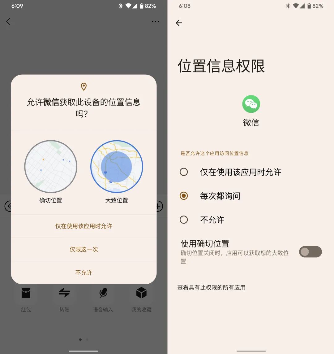 Android 12 还带来了一招隐私的“主动防御”,若有应用请求你的精确定位时,你可以返回一个大致的位置。
