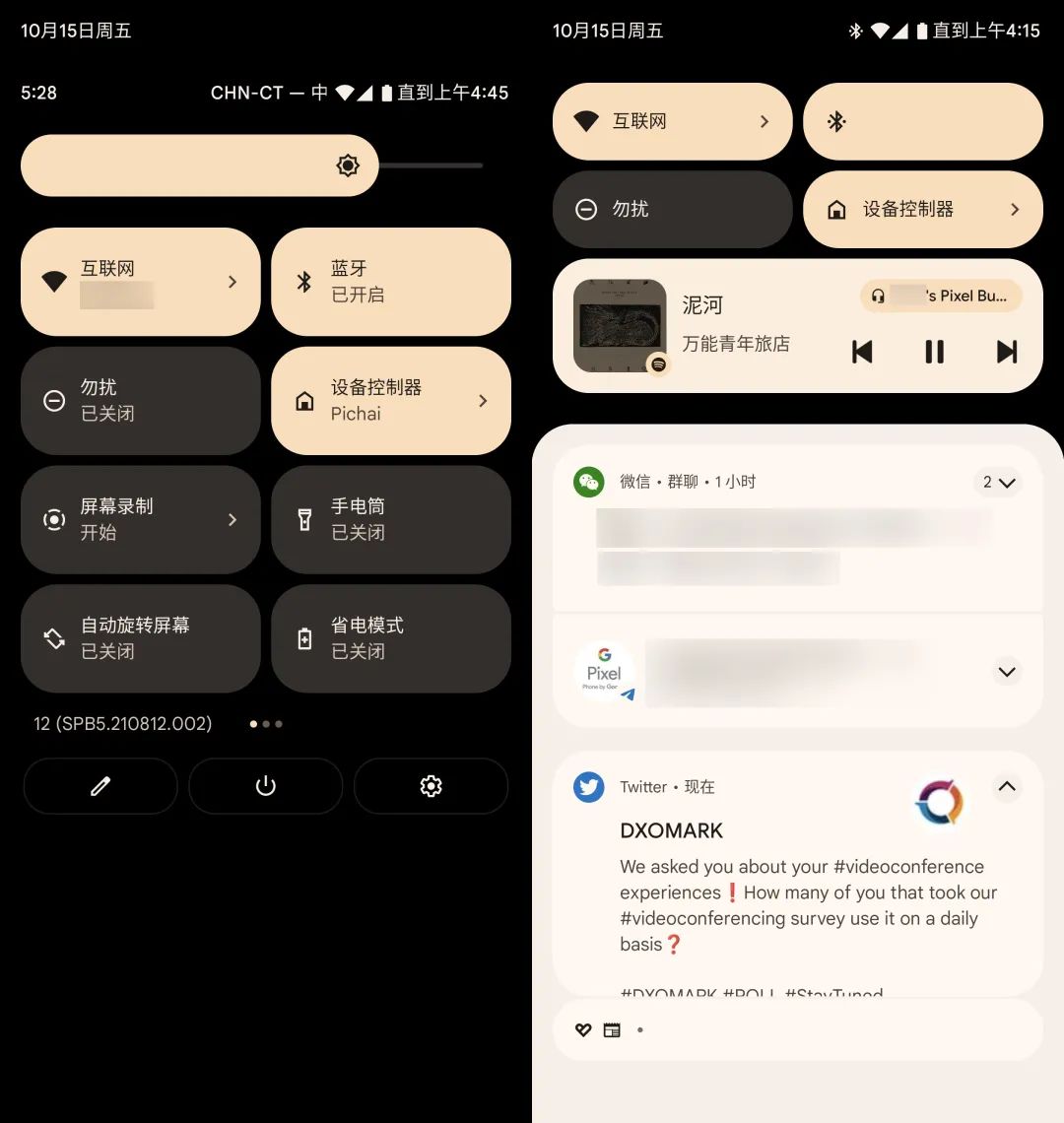 接下来再说形状。持续的圆角化在 Android 12 达到了极致,集中体现在快捷设置面板、小组件、媒体控制等。新设计的状态栏,有没有给你特别眼熟的感觉,MIUI 谷歌分 UI?