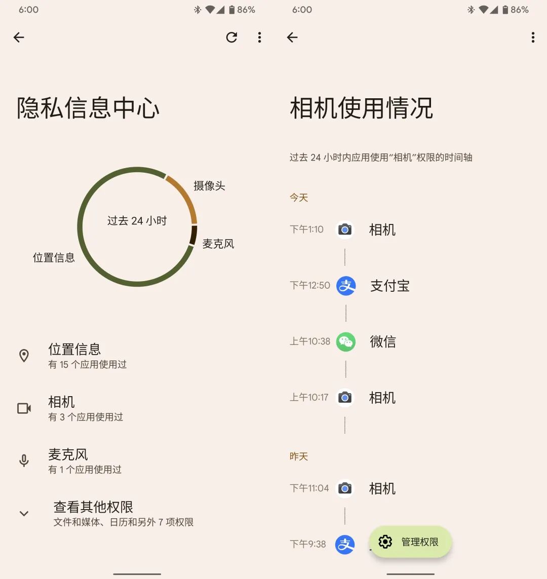 隐私是头等大事。Android 12 在系统设置中新增了隐私信息中心,可以显示哪个应用于何时访问麦克风、摄像头和位置数据。