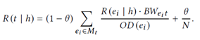 其中,M_t 是所有通向节点 t 的节点集合,OD(e_i) 是节点 e_i 的出度,BW(e_it)是从节点到节点 t 带宽。因此对于 M_t 中个每个节点 e_i,从节点 e_i 到节点 t 转移的资源量为。因为知识图谱中可能存在的错误和噪声,构造的有向图并不完美并且可能存在影响资源流动的闭合回路。因此为了提高模型的容错率,假设每个节点的资源流都有相同概率θ可以直接跳转到的随机节点,并且随机流向t的这部分资源是 1/N,其中 N 是节点总个数。