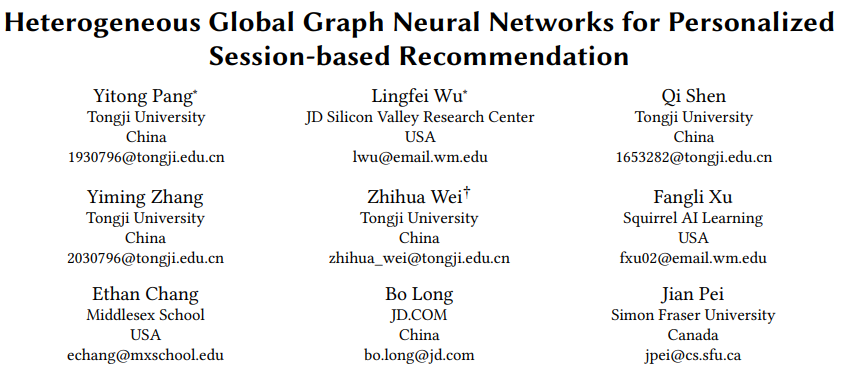 本文是针对会话推荐提出的相关方法,兼顾历史会话信息和会话中商品间的转换模式,提出异构全局图网络HG-GNN,利用所有会话中的商品转换(历史和当前的会话)来推断用户的偏好。全局图包含会话内的item-item关系,user-item关系和全局item共现关系。同时提出一个个性化会话编码器,结合当前会话的一般用户偏好和临时兴趣来生成个性化会话表征进行推荐。本文主要包含两个方面: