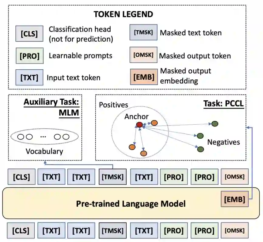 如上图,CP-Tuning算法放弃了经典算法中以“[MASK]”字符对应预训练模型MLM Head的预测输出作为分类依据,而是参考对比学习的思路,将句子通过预训练模型后,以“[MASK]”字符通过预训练模型后的连续化表征作为features。在小样本任务的训练阶段,训练目标为最小化同类样本features的组内距离,最大化非同类样本的组间距离。在上图中,[OMSK]即为我们所用于分类的“[MASK]”字符,其优化的features表示为[EMB]。因此,CP-Tuning算法不需要定义分类的标签词。在输入侧,除了输入文本和[OMSK],我们还加入了模版的字符[PRO]。与经典算法不同,由于CP-Tuning不需要学习模版和标签词之间的对应,我们直接将[PRO]初始化为任务无关的模版,例如“it is”。在模型训练过程中,[PRO]的表示可以在反向传播过程中自动更新。除此之外,CP-Tuning还引入了输入文本的Mask,表示为[TMSK],用于同时优化辅助的MLM任务,提升模型在小样本学习场景下的泛化性。CP-Tuning算法的损失函数由两部分组成: