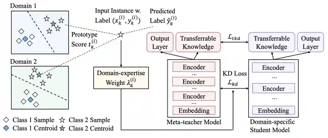 其中,MetaKD算法包括两个阶段。第一个阶段为元教师模型学习(Meta-teacher Learning)阶段,算法从多个领域的训练数据协同学习元教师模型,它对每个领域的样本都计算其典型得分(Prototype Score),使更具有跨领域典型性的样本在学习阶段有更大的权重。第二个阶段为元蒸馏(Meta-distillation)阶段,将元教师模型选择性地蒸馏到特定领域的学习任务上。由于元教师模型可能无法做到在所有领域上都有精确的预测效果,我们额外引入了领域专业性权重(Domain-expertise Weight),使元教师模型只将置信度最高的知识迁移到学生模型,避免学生模型对元教师模型的过拟合。