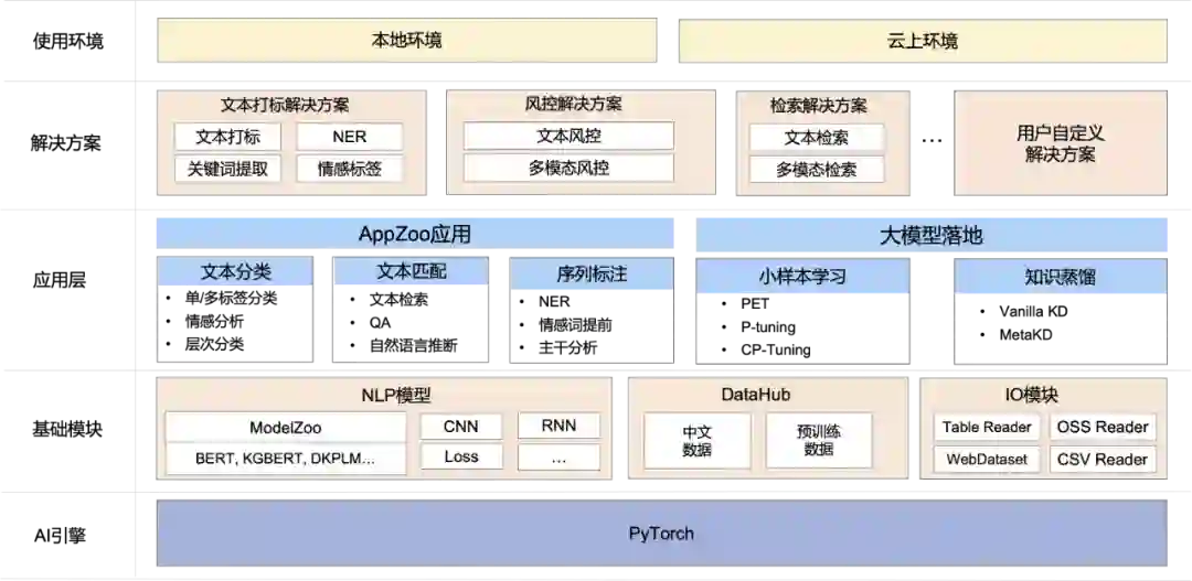 • 应用层:AppZoo支持常见的NLP应用比方说文本分类,文本匹配等;EasyNLP支持预训练模型落地工具,包括小样本学习和知识蒸馏,助力大模型快速落地,这里也集成了多个PAI团队自研的算法;