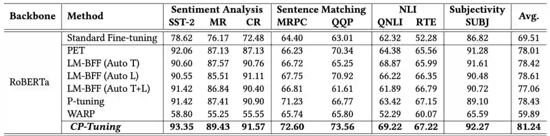 如上所示,两个部分分别为Pair-wise Cost-sensitive Contrastive Loss(PCCL)和辅助的MLM损失。我们在多个GLUE小样本数据集上进行了验证,其中训练集中每个类别限制只有16个标注样本。从下述结果可以看出,CP-Tuning的精确度超越了经典的小样本学习算法,也比标准Fine-tuning算法的精确度高10%以上。