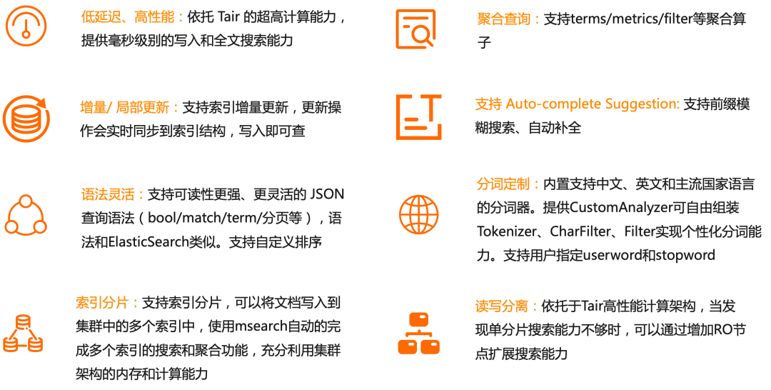 TairSearch 是Tair自主研发的高性能、低延时、基于内存的实时搜索特性,不但增强了 Tair 在实时计算领域的能力,还和现有的其他数据结构一起为用户提供一站式的数据解决方案。Tair采用了和 ElasticSearch(下文称之为ES)相似的基于 JSON 的查询语法,满足了灵活性的同时还兼容ES用户的使用习惯。Tair 除了支持 ES 常用的分词器,还新增JIEBA 和 IK 中文分词器,对中文分词更加友好。Tair支持丰富的查询语义和聚合能力,并且支持索引实时更新和局部更新。Tair 可以通过 msearch 方案实现索引的分片和搜索能力,并通过读写分离架构实现搜索性能的水平扩展。