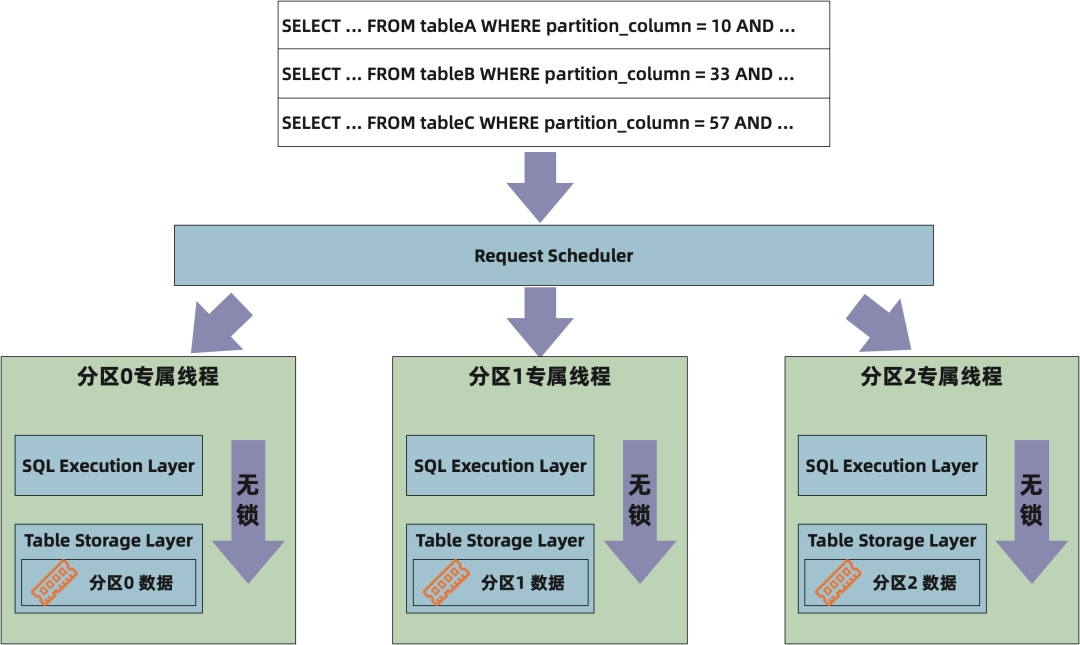 在提升单机引擎的并发上,SQL 场景使用了另外一种解法,让每一个 Partition 的数据由一个单独的线程来进行处理,这样能在引擎内部通过增加分区达到线性的扩展,而且无需使用前面提到的无锁实现中常会使用的重试步骤。相对于上面的方案,这种方案的工程难度更低,且能够天然地支持 Serializable 的事务隔离级别,某一特定时刻只有一个事务能够运行在特定的分区上,增加 undo buffer 即可以保证事务的原子性。