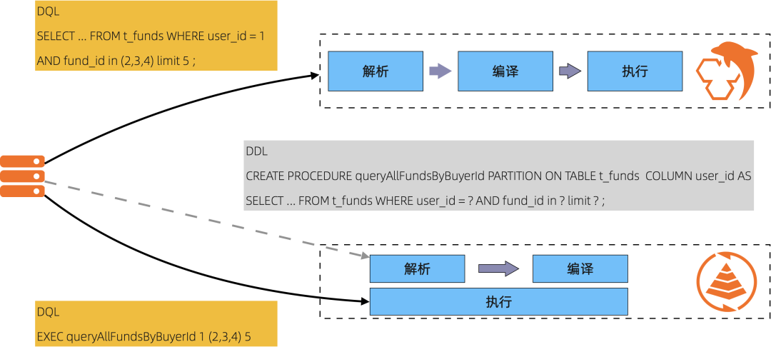 经典的 NoSQL 系统,提供的 API 都是和服务端的处理流程非常耦合的,比如说 Redis 提供了很多 API,光是 List 就有 20 多个接口。在服务端其实很多接口的执行过程中的步骤是比较类似的,比如说有一些 GenericXXX 的函数定义。我们再看看一般的 RDBMS 中的处理 SQL 的流程,一般是 解析(从 SQL 文本到 AST),然后是优化器编译 (把 AST 编译成算子,TableScan、Filter、Aggregate),然后是执行器来执行。类比到 Redis 中,用户传进来的就是 AST,且服务端已经预定了执行计划,直接执行就行了。如果我想使用 SQL,不想学习这么多 API,同时由于我的访问场景是比较固定的,比如进行模板化之后,只有十多种 SQL 语句,且访问的数据比较均衡,某一条特定的语句所有的参数用一条特定的索引就足够了,有没有办法在执行过程中省去解析、编译的开销来提高运行的效率?有很多同学可能已经想到了存储过程。是的,存储过程很多场景是在扩充表达能力,比如多条语句组成的存储过程,需要进行比较复杂的逻辑判断,单条语句存储过程本质上是在灵活性和性能上进行折衷。Tair 所有线上运行的 SQL 都是预先创建存储过程的,这样进行访问就类似于调用 Redis 的一个 API 了,这是在复杂计算逻辑的场景下保证低延时的一种方案。
