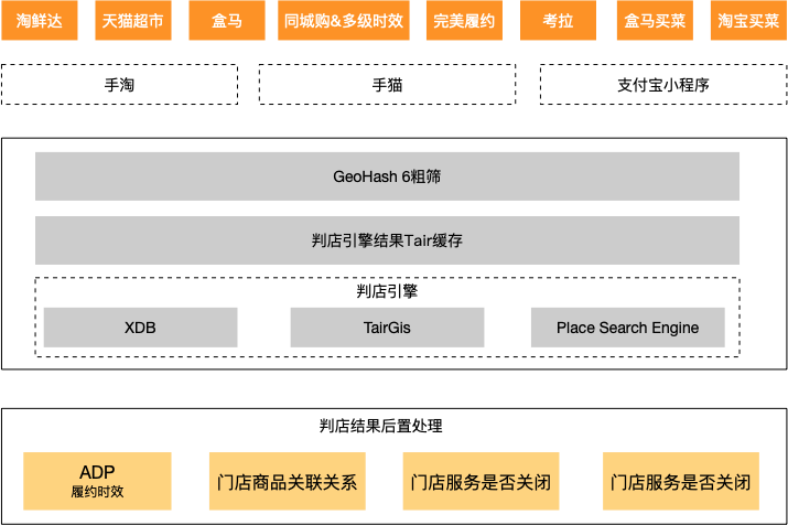 新一代判店系统,依托 Tair 的 Gis 能力,底层使用 RTree 结构,支持常见的 Contains, Within, Intersects 等关系判断,可以在 ms 级别返回查询数据,目前已经在淘菜菜、天猫超市、淘鲜达、盒马、同城购等多个业务使用。